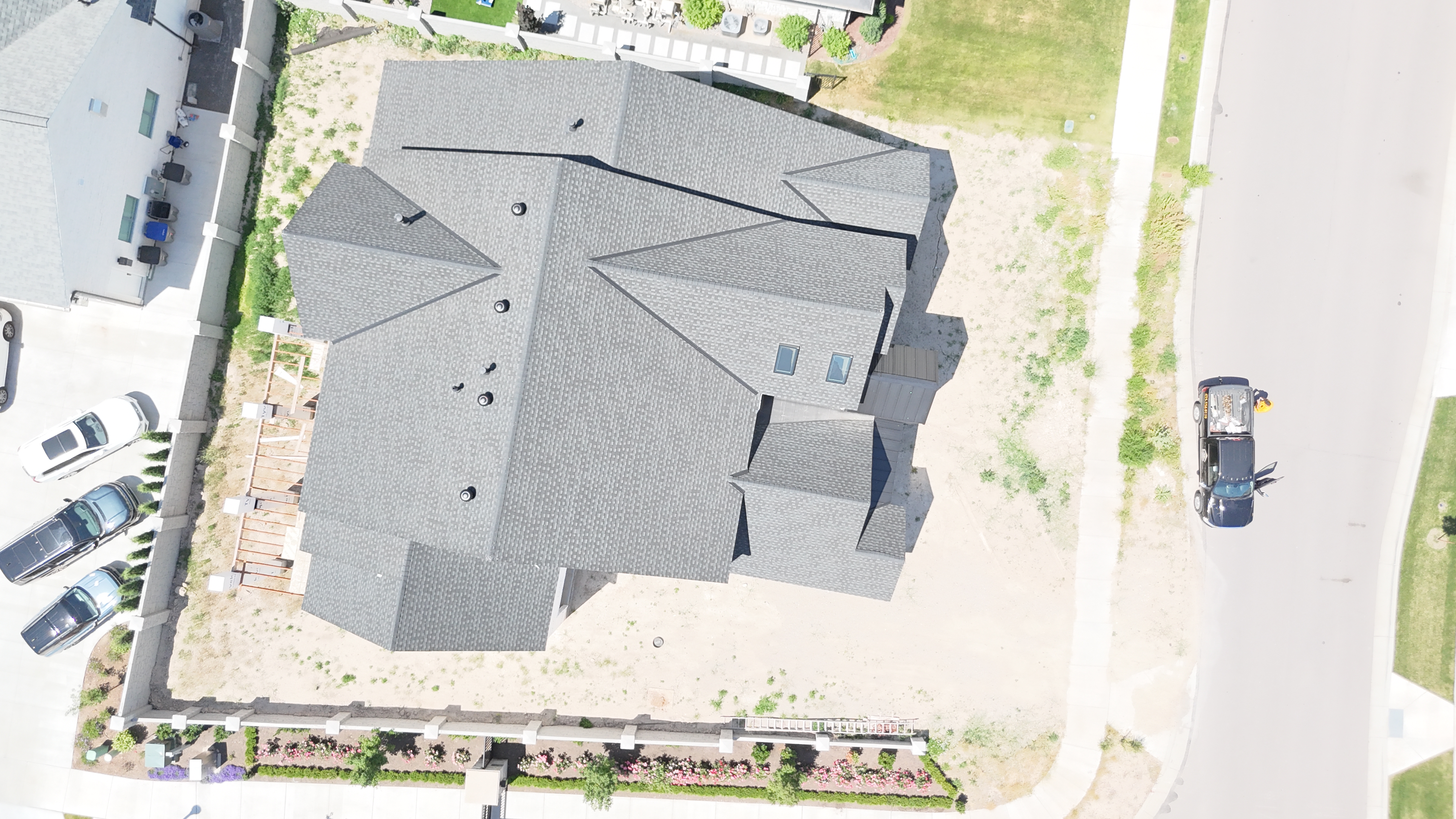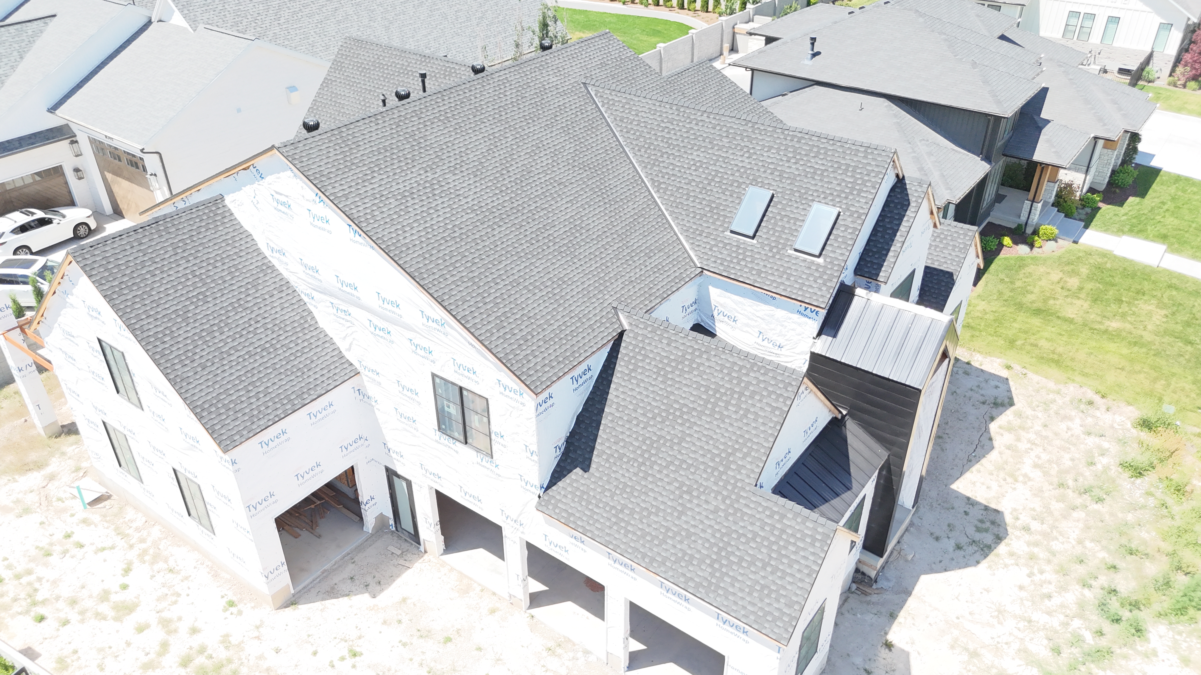 Approx. 5,237 sqft installation. SingleFamily home. Currently under Construction. Style: Shingles Type: GAF Timberline HDZ Color: Charcoal Extra Features: Ridge venting Metal Valleys 26 Gauge metal roofing Deep Black and siding around front entry Comments: "We were able to complete the removal of the old roof and install the new within just a few days window. Small repairs included and lots new features when finished."1 |